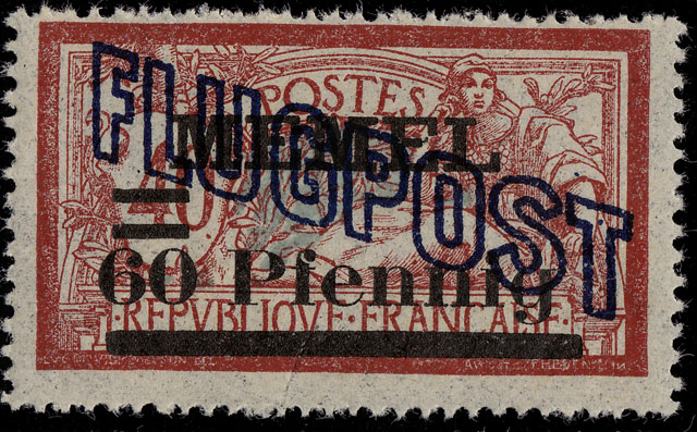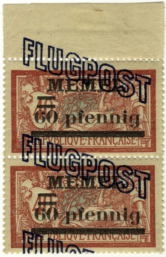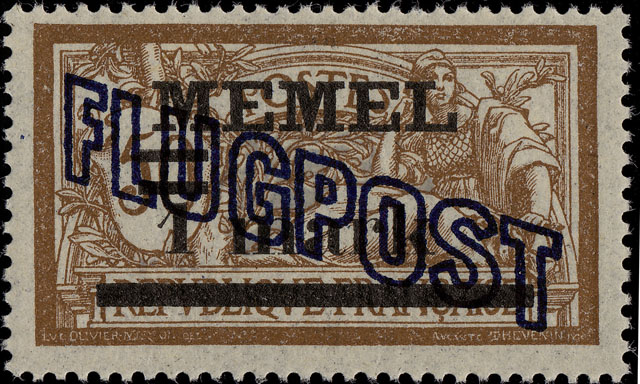 "Mit Genehmigung des Herrn Oberkommissars für das Memelgebiet werden vom 6. Juli ab zur Freimachung von Flugpostsendungen Flugpostmarken zu 60, 80 Pf. l, 2, 3 und 4 Mark herausgegeben. Die Wertzeichen sind zwecks bessere Kenntlichmachung der Flugpostsendungen und deren Unterscheidung von anderen Postsendungen bestimmt. Die neuen Wertzeichen sind derartig hergestellt, dass die genannten Werte der französischen Überdruckmarken von links oben nach rechts unten meinen einem neuen blauen Überdruck "Flugpost" versehen worden sind. Memel, den 5. Juli 1921. Landes-Postdirektion"