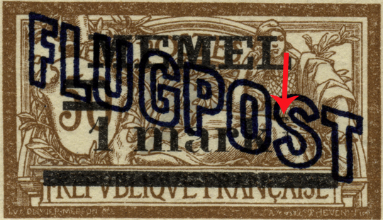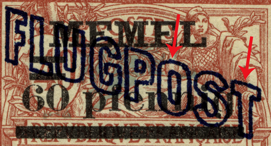 Die erste Lieferung vom 2. Juli 1921 wurde ohne Punkt im "T" des Wortes "FLUGPOST" im Leerraum des Querbalkens hergestellt, eine zweite Lieferung vom 30./31.Juli 1921 mit den zwei Werten 60 Pfennig/40 c und 60 Pfennig/40 c sowie eine Nachlieferung des dritten Wertes 1 mark/50 c im Mai 1922 musste von einem neuen Druckstein hergestellt werden, weil der Druckstein der 1. Auflage bereits abgeschliffen worden war. Für die 2. Druckauflage hat der Lithograph in den Querbalken des "T" von FLUGPOST als Geheimzeichen einen Punkt eingeätzt.