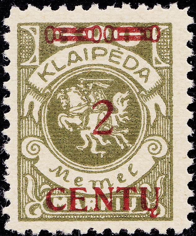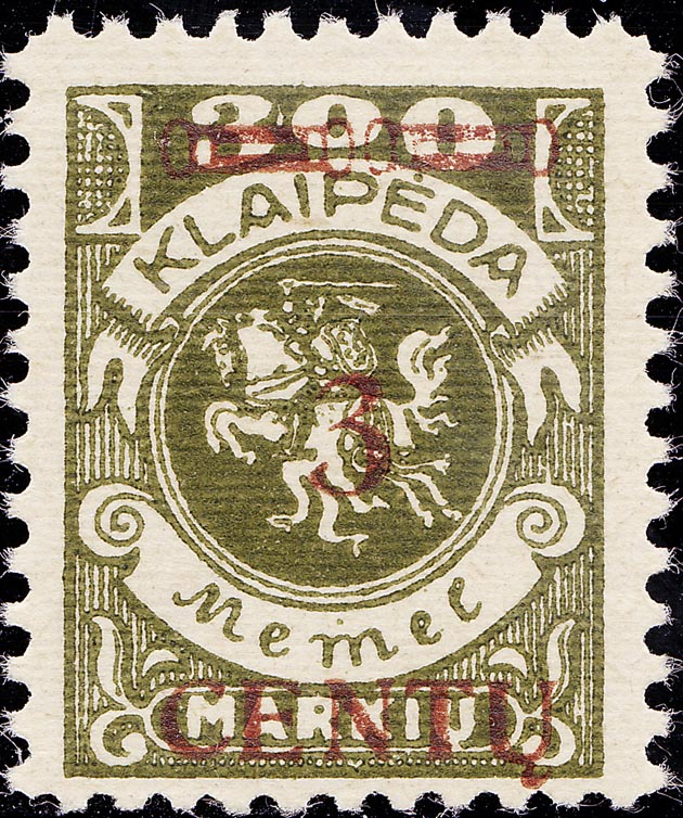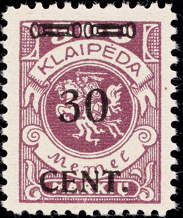 Feld: I/38 "K" in KLAIPEDA links abgebrochen Feld: II/2 weißer Fleck an der "3" von 300 oben rechts Feld: III/15 rechte Ecke im Unterrand abgeschliffen Feld: III/80 "K" in KLAIPEDA im rechten oberen Strich durchbrochen