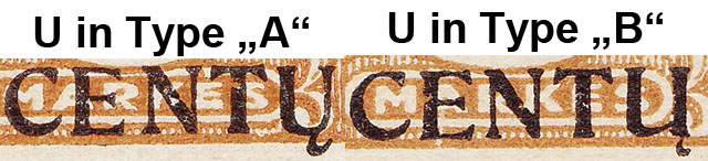 Nachdem die ersten Ausgaben fertig waren, stellte man fest, dass die zwei verschiedenen Formen des "U" kein einheitliches Bild abgaben. Um diesen Mangel zu beheben, hat man bei den nächsten Ausgaben (Mi.-Nr. 174-175) das "U" in CENTU weggelassen und durch einen Punkt ersetzt. Wie oben beschrieben, war bei der zweiten Type des "U" (im Michel Type B) zusätzlich der Abstand zwischen (C)E--N(T) enger, nämlich 0,6 statt 0,9 mm. Dieser Unterschied ist erhalten geblieben. Nur statt die Typen dieser Ausgaben wieder in A und B einzuordnen, werden die Felder mit den ehemaligen B-Typen im Michel nun mit dem Zusatz "e" (enger Abstand) gekennzeichnet.