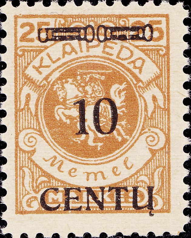 Von der für diese Ausgaben gesetzten 100er Platte konnten natürlich nur die Balken weiterbenutzt werden. Für den Höchstwert wurde nun "LITAS" statt "CENT." eingesetzt. Für diesen Höchstwert brauchte man auch eine dickere Type der "1", die "1" der 10 CENT. war zu dünn. Und wieder trat das Problem auf, dass in dieser kleinen Druckerei nicht genügend, vor allem einheitliches Setzmaterial vorhanden war. Es wurden alle möglichen Typen einer "1" zusammen gebracht. So kam es zu diesen vielen unterschiedlichen Zifferntypen, die auch noch z.T. beschädigt waren oder während des Druckes verletzt wurden. Dadurch ist die Zuordnung nicht immer leicht.