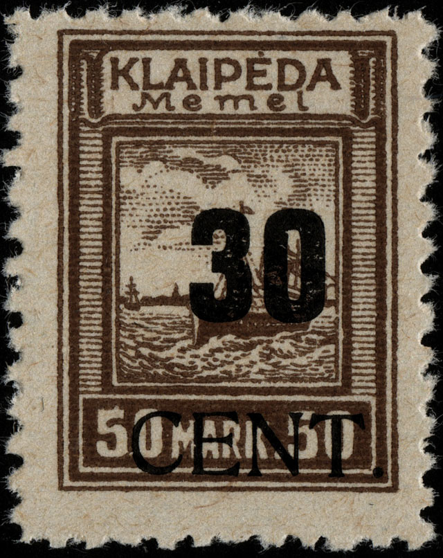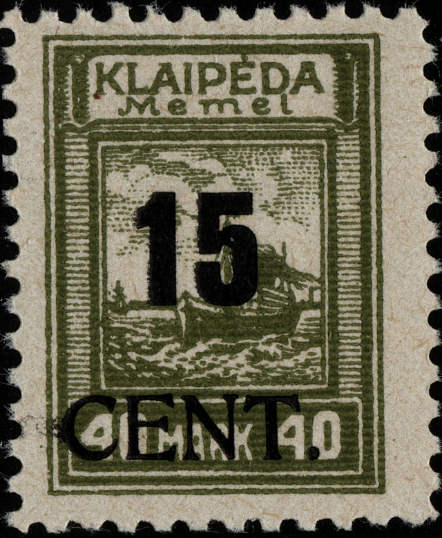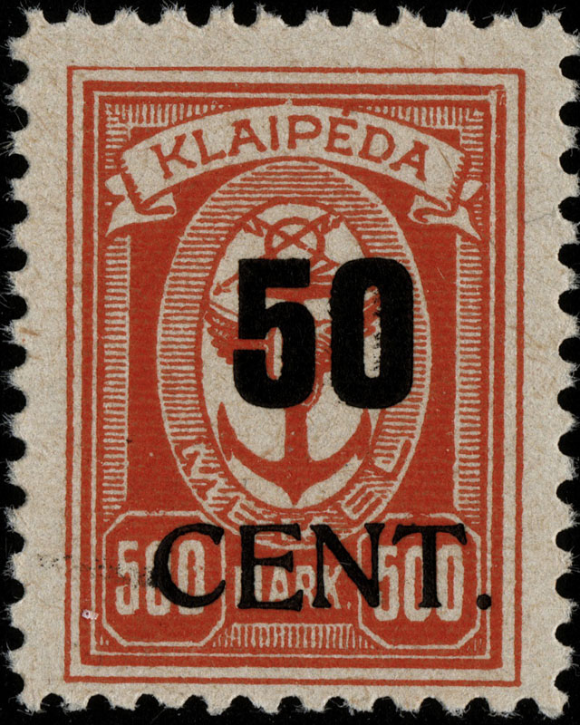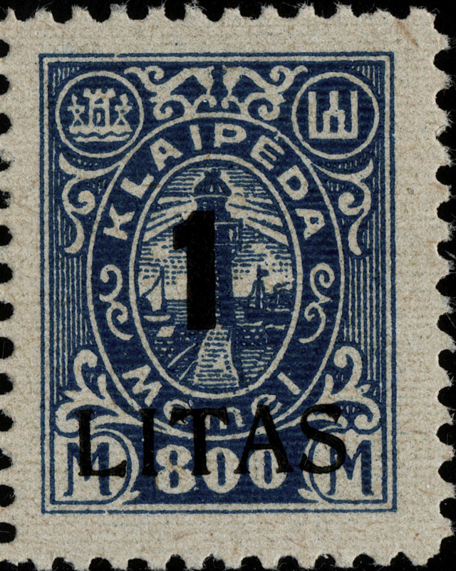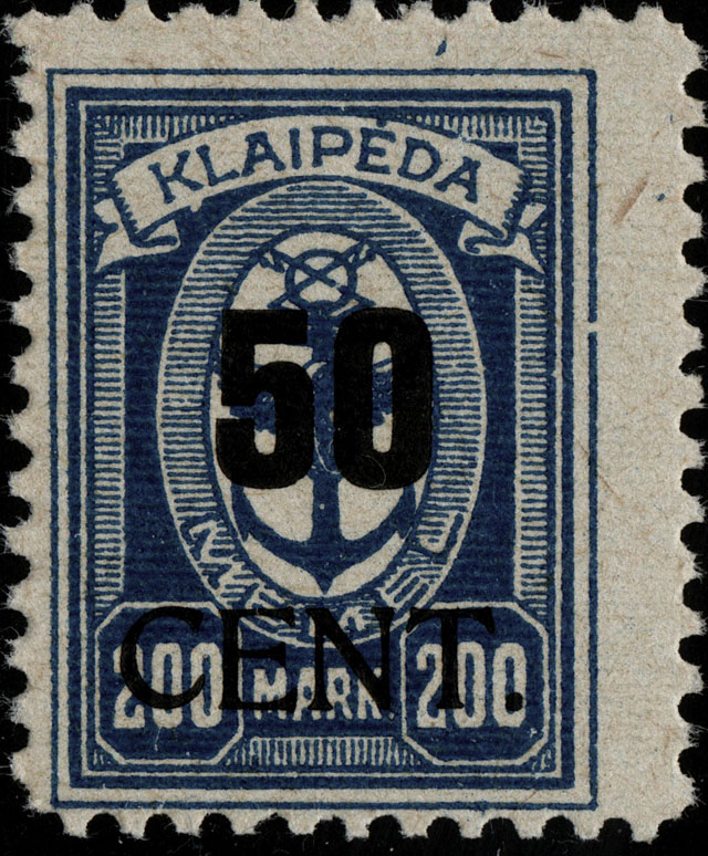 Feld: 1 Bruch im rechten Außenrand, 1,0 mm von unten Feld: 39 Farbstrich durch "A-1" in KLAIPEDA: "I" wie "1"