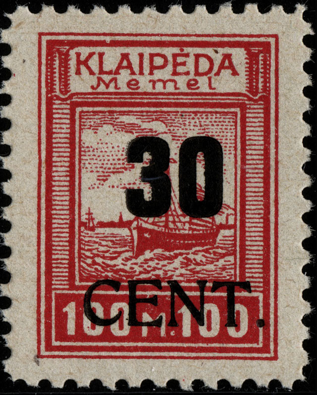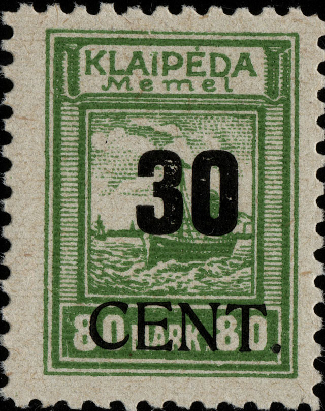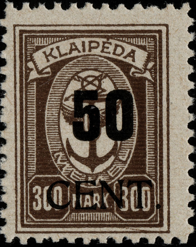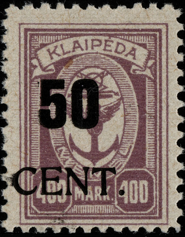 Feld: 1 obere Kante am Schriftband über "K" von KLAIPEDA gebrochen, 3,6 mm von links Feld: 79 weißer Durchbruch im dicken Oberrand über "AI" in KLAIPEDA, 7,5 mm von links