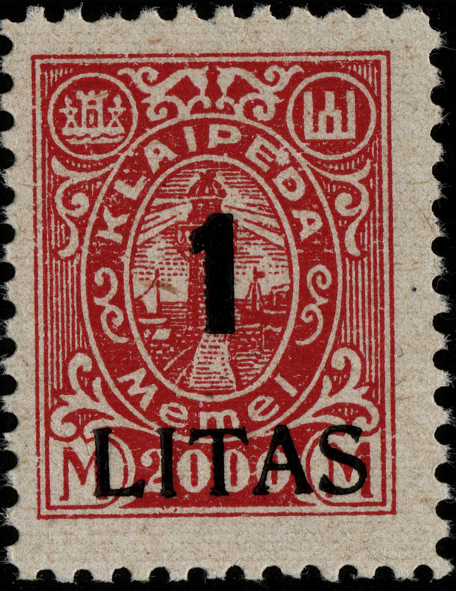 Feld: 13 "D" in KLAIPEDA oben rechts durchbrochen (li. Bogen) Feld: 31 linker Wimpel unten mit weißem Fleck (li. Bogen) Feld: 79 Farbpunkt im Unterrand. Die nun nachfolgend aufgeführten LITAS-Werte gehören alle zur Aufdruckgruppe "B". Diese Werte haben nicht nur die engen Abstände zwischen Wertziffer --- LITAS von 4,0 mm, statt normal 4,6 mm, sondern auch die Eigenarten von unterschiedlichen Buchstabentypen und besondere Abstände in der Wertbezeichnung "L I T A S"