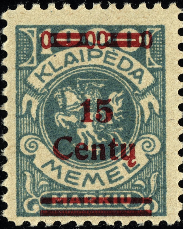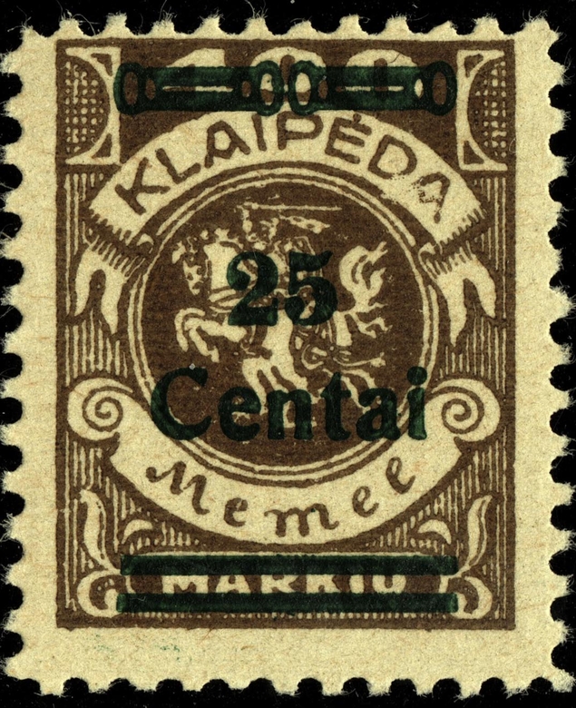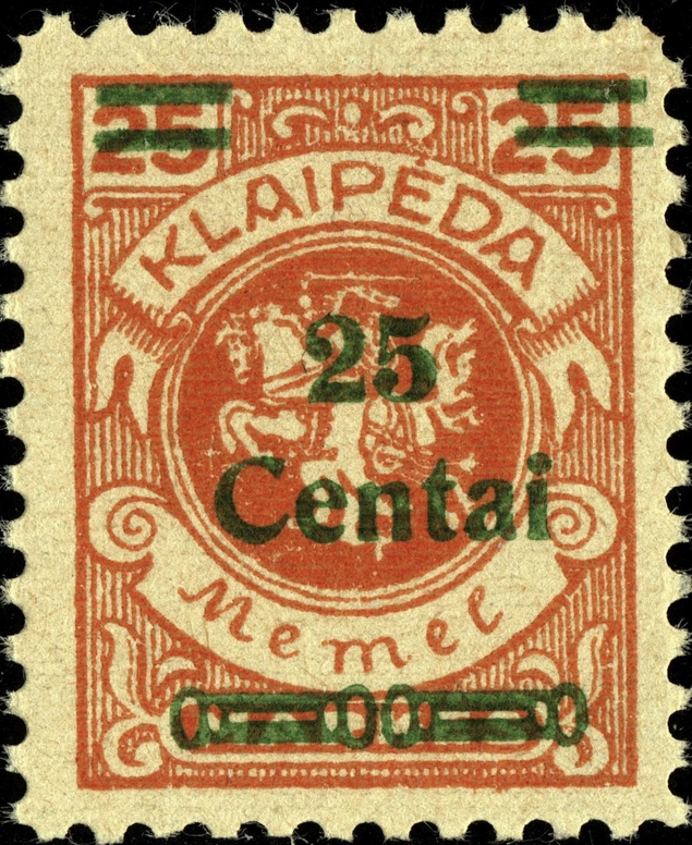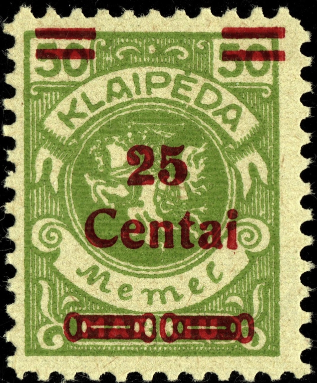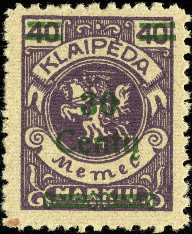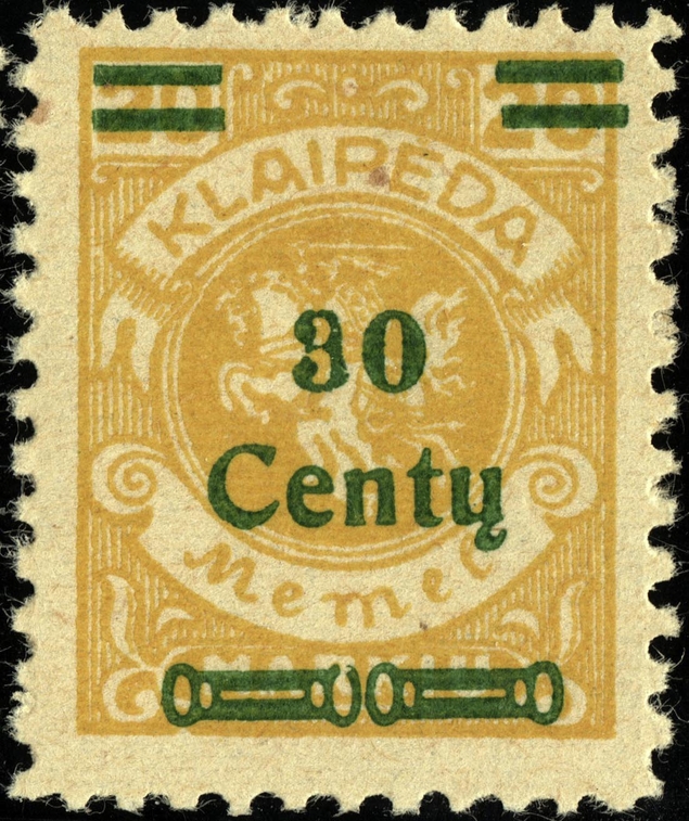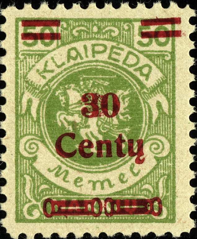 Noch immer zog sich die Einverleibung des Memelgebietes in Litauen hin. Infolge dessen benötigte man weiter Postwertzeichen für den "Status Memelgebiet". Für die hohe Wertstufe "1 LITAS" hatte man das Problem gelöst, in dem eine II.Platte der Mi.-Nr. 192 gedruckt wurde (siehe dort). Für die gebräuchlichen Werte zu 15 CENT.; 25 CENT. und 30 CENT. ging man ähnlich vor. Auch hier wurden die reichlichen Restbestände der Wappenreiterausgabe (Mi.-Nr. 141 - 150) als Urmarken für eine neue Aufdruckausgabe genutzt, und zwar alle Werte. Entsprechend der verschiedenen Wertangaben der Wappenreitermarken mußte man auch einen Aufdruck in verschiedenen Formen setzen, um die Wertangaben zu annullieren.
